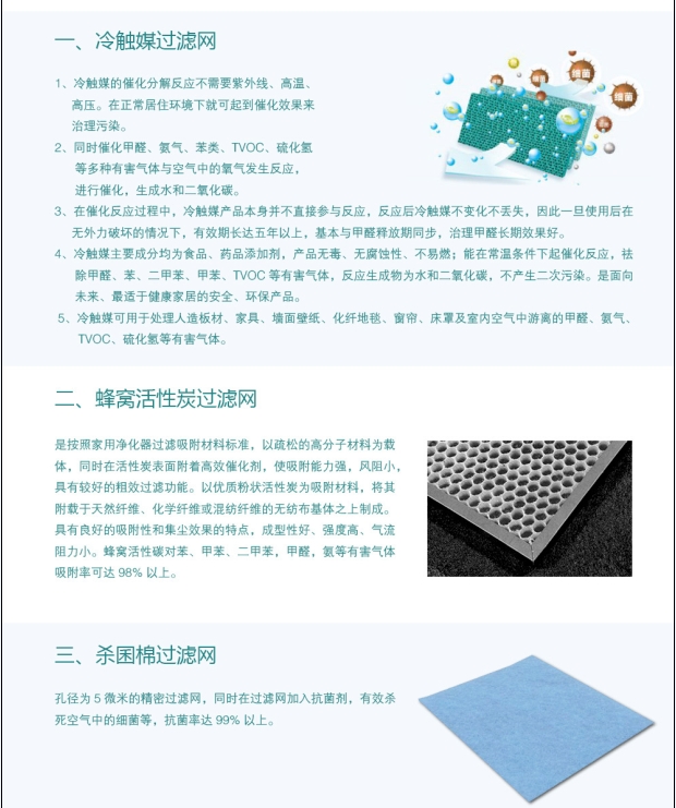 | 自然菌去除率 | 96.8% | 過(guò)濾濾網(wǎng) | 冷觸媒+蜂窩活性炭復(fù)合濾網(wǎng)/ 抗菌棉+HEPA復(fù)合濾網(wǎng) |